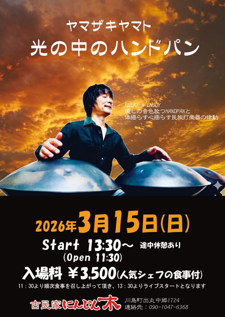 ハンドパン奏者・ヤマザキヤマトによる癒しのライブを開催いたします。