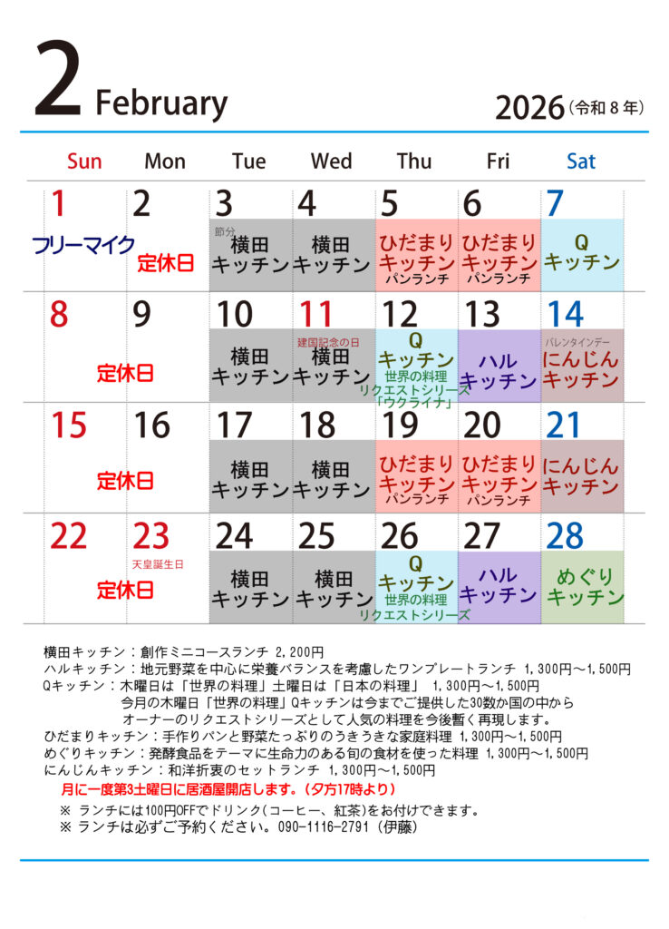 Qキッチン 木曜日は世界の料理、土曜日はおにぎりなど日本の料理